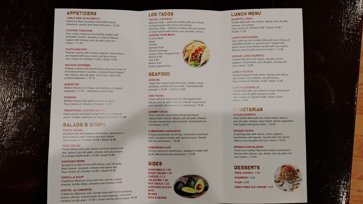 Deep fried tortilla with your choice of meat, filled with rice, beans and cheese. Topped with sour cream, red sauce and cheese dip
